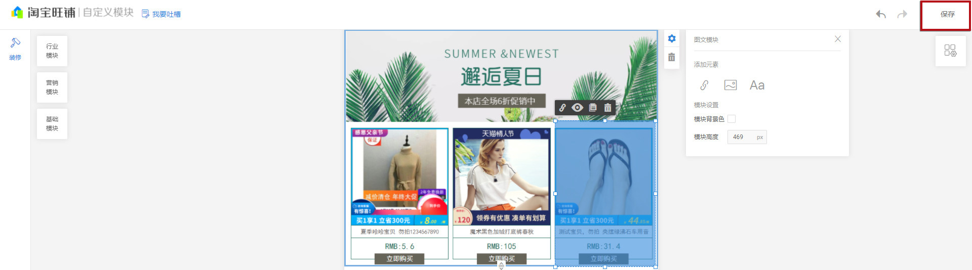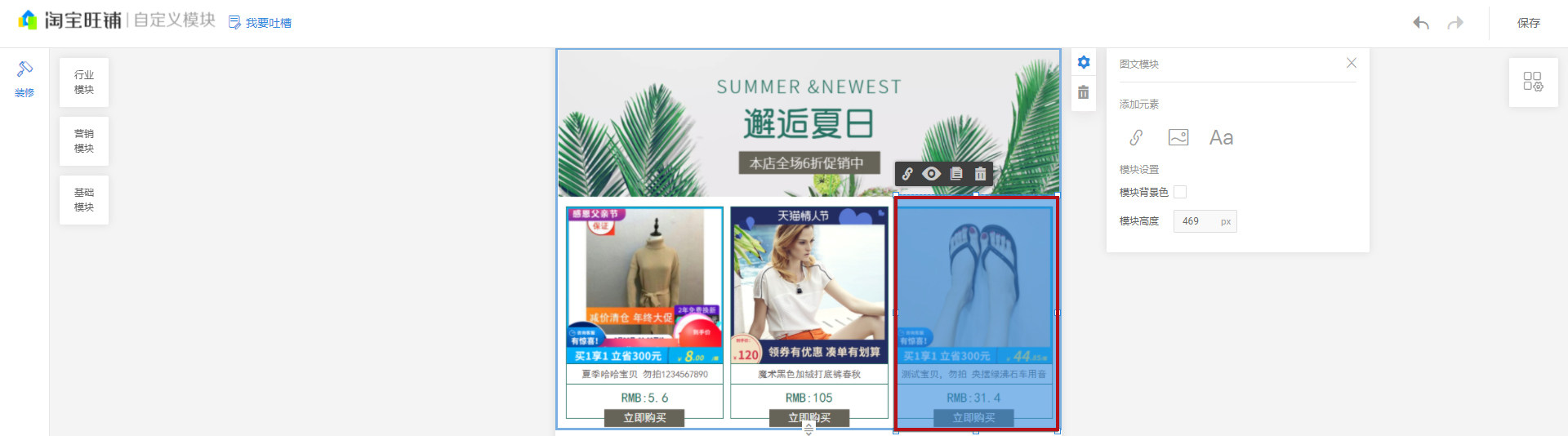 点击刚添加的图文模块,可调整放置位置、重新编辑模块信息(包括替换图片、尺寸、元素等)等
