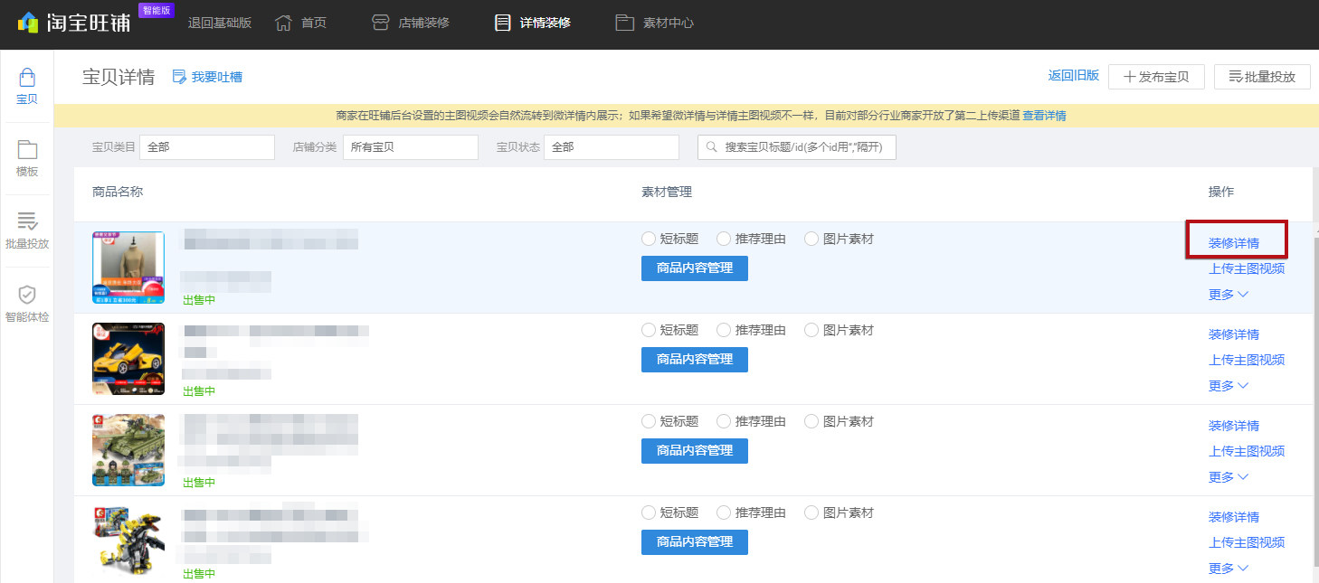 第八步、在宝贝列表中找到要投放的宝贝,点击【装修详情】