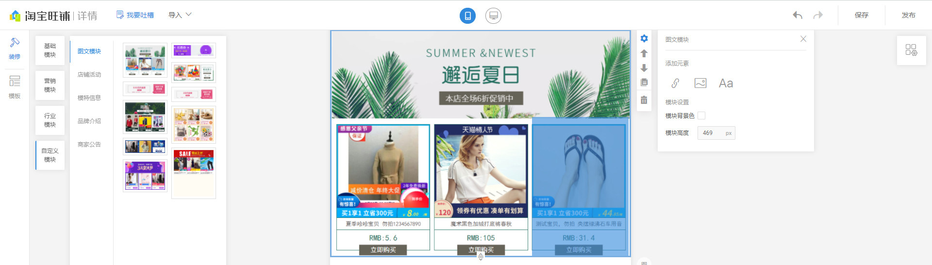 第九步、左侧栏【自定义模块】—【图文模块】。点击选择刚设置的模块,点击右上角保存并发布即可。