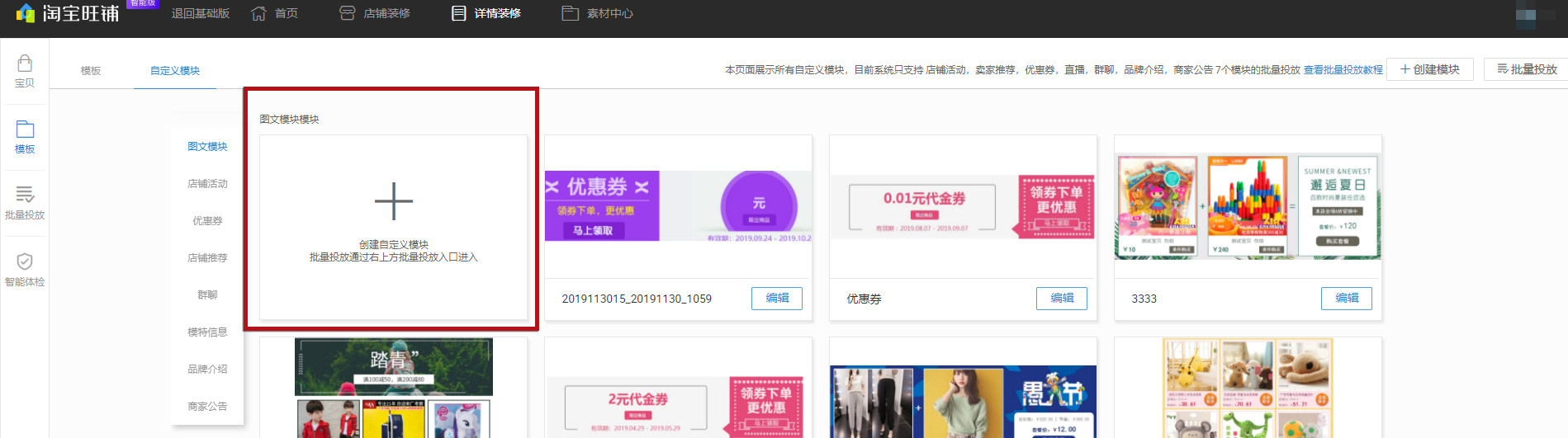 选择【店铺活动】,点击【创建投放模块】